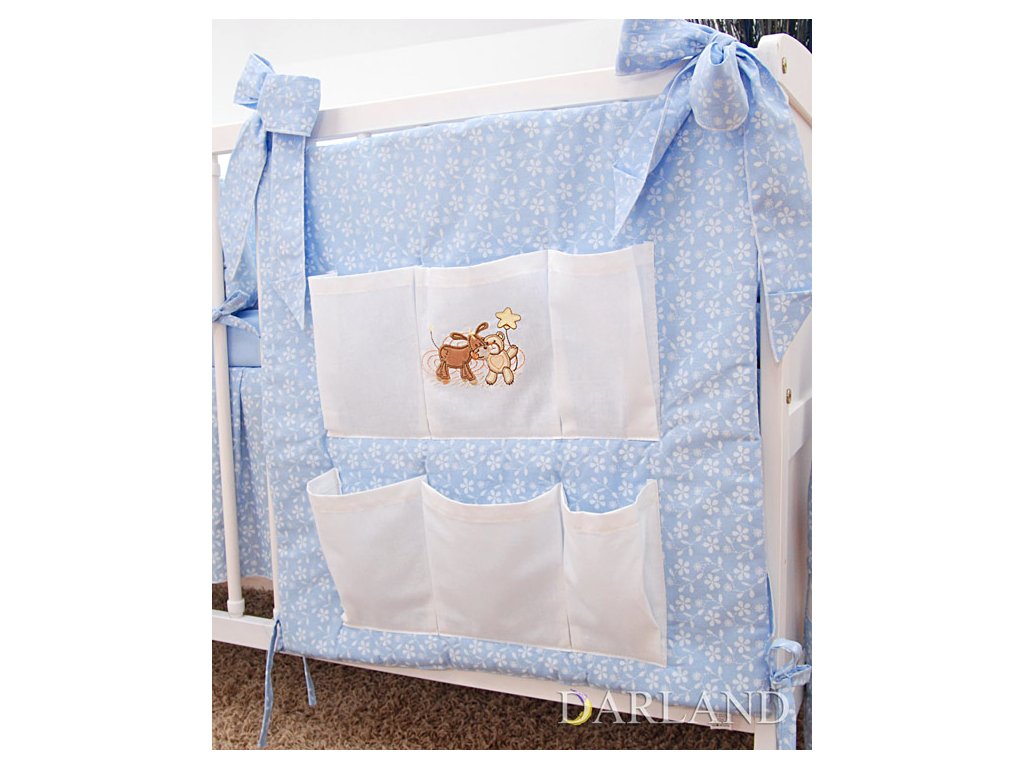 Kapsář na postýlku Vašeho miminka je praktickým pomocníkem, kde můžete odkládat plenky, dudlíky, hračky... Má 6 kapes, upevňuje se nahoře pomocí látkových popruhů, takže dokonale přiléha k postýlce. Vyrobeno ze 100% bavlny, certifikováno, atest, 1.jakost (produkt určen pro děti). Bavlna s ...