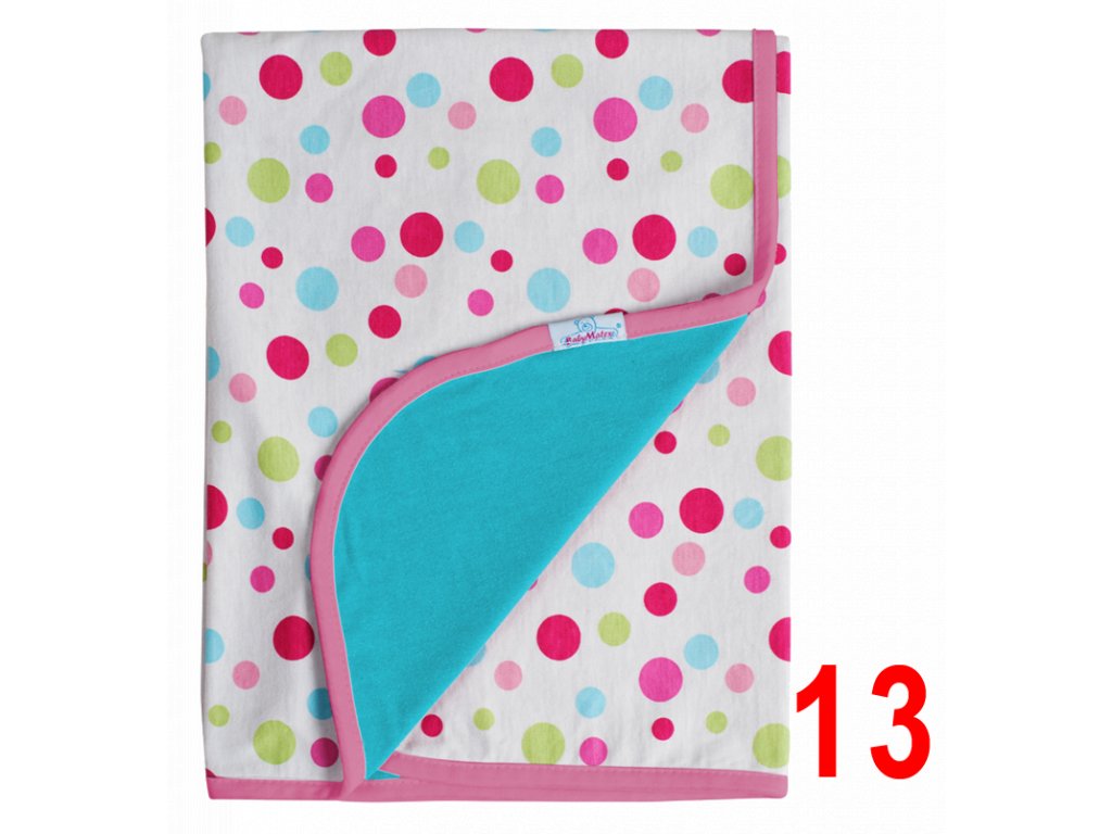 Puntíkatá měkká a příjemná deka je ideálním doplňkem do postýlky nebo kočárku. Tuto deku můžeme mít všude s sebou, kde je třeba, aby bylo miminko zakryto, chráněno před průvanem. Je vyrobena z bavlněného Jersey, 100% bavlna. Z jedné strany jsou barevné puntíky, z druhé je deka jednobarevná. Prát na 40 stupňů.
